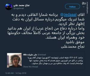 - آقای ” محمد علی ” خود ،در توئیتی که به ” علیزاده” زده است از همراه نبودن مردم عرب با حکومتهای خود در موضع گیری آنها در باره ج.ا. گفته است ، پس خود ایشان هم قبول دارند که دولت عراق هم بعنوان یک دولت عربی با ج.ا. همراه نیست ، آیا مخالفت مردم بصره با دولت خود در باره ج.ا. در حد قیام بر علیه دولت خود و وارد شدن آنان به جنگ با آمریکا ست و میدانیم که این ادعایی توخالی و مبتنی بر تجهیز شدن و تغذیه ( فکری ) بعضی از فعالان وتحلیلگران از سوی ج.ا. برای موجه نشاندادن سیاست شکست خورده دخالت های خارجی خود است .